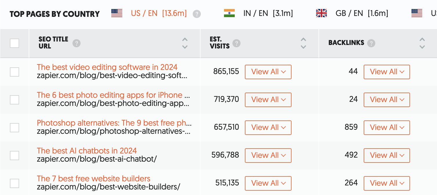 Zapiers top 5 pages with the highest estimated traffic are indeed listicles. Blogs about the best tools for video editing, best AI chatbots, top photo editing apps, and so on.